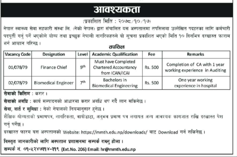 Required: Certificate of qualification, citizenship, BIO-DATA, experience letter, and other training papers need to be submitted to Manmohan memorial medical college's official website.
