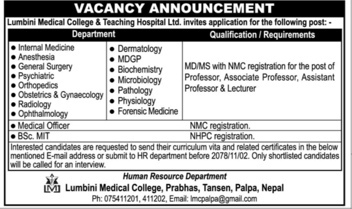 Lumbini Medical College & Teaching Hospital Ltd. invites applications for the post of: Professor, Associate Professor, Assistant Professor, and Lecturer.